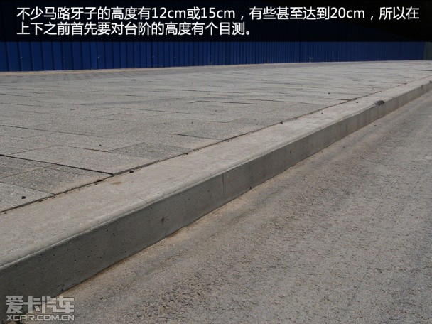 不少马路牙子的高度有12cm或15cm,有些甚至达到20cm,所以在上下之前首先要对台阶的高度有个目测,感觉会托底可以寻找其它停车地点停车,切记不要冒然尝试。