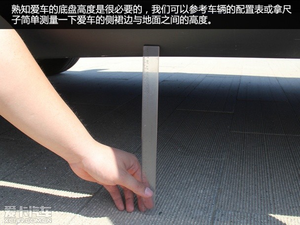 熟知爱车的底盘高度是很必要的,我们可以参考车辆的配置表或拿尺子简单测量一下爱车的侧裙边与地面之间的高度,做到心中有数就可以避免托底的危险。