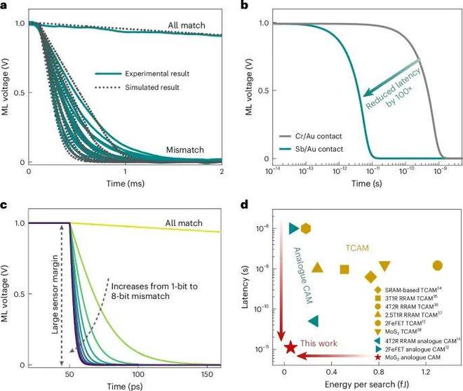 图5a展示了实验测得的放电曲线:当仅有一行匹配时,其匹配线电压保持高位,而其他不匹配行则迅速放电。实验还验证了1比特至7比特不匹配情况下的放电行为。虽然片外测量中的大电阻电容延迟限制了实测搜索速度,但基于实验校准的模型模拟表明,采用半金属接触的MoS₂闪存可大幅降低延迟(图5b)。对于一个8 × 16阵列,在0.5 V感应裕度下,1比特不匹配的延迟约为36 ps。进一步的模拟显示,消除片外寄生效应后,延迟可进一步降低至11 ps每单元每搜索(图5c)。性能基准对比(图5d)表明,与传统的基于7 nm FinFET工艺的静态随机存取存储器三态内容可寻址存储器、基于阻变存储器的数字/模拟内容可寻址存储器、基于铁电的数字/模拟内容可寻址存储器以及MoS₂三态内容可寻址存储器相比,本工作的MoS₂模拟内容可寻址存储器在每次搜索能量和延迟方面均有显著提升。