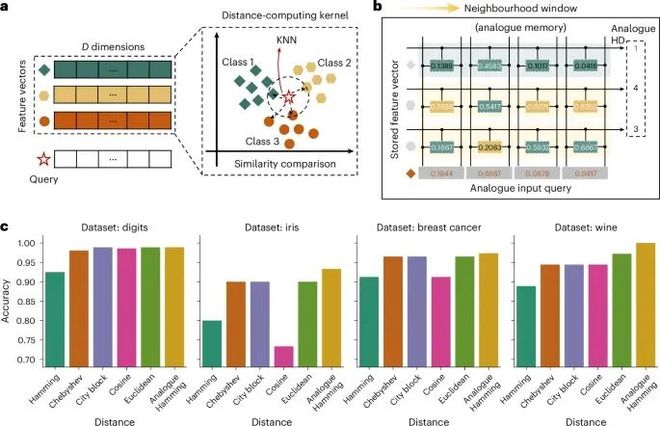 模拟内容可寻址存储器的内存内搜索功能在机器学习中有广泛应用前景。本研究展示了在其模拟内容可寻址存储器中进行k近邻搜索(图6a)。与三态内容可寻址存储器通常对二值化数据使用数字汉明距离不同,模拟内容可寻址存储器使用模拟汉明距离作为相似性度量,允许元素比较中存在微小失配,这通过其范围搜索功能实现。模拟特征数据可直接以一定邻域窗口(如0.1 V)作为匹配范围嵌入内容可寻址存储器矩阵(图6b),从而高效计算模拟汉明距离。在四个经典数据集上的测试表明(图6c),使用模拟汉明距离的分类精度至少与其他距离度量方法相当甚至更优。模拟内容可寻址存储器能高效实现该计算,与中央处理器相比可实现约10⁴倍的延迟提升,与使用三态内容可寻址存储器计算传统汉明距离相比也有显著加速和精度优势。