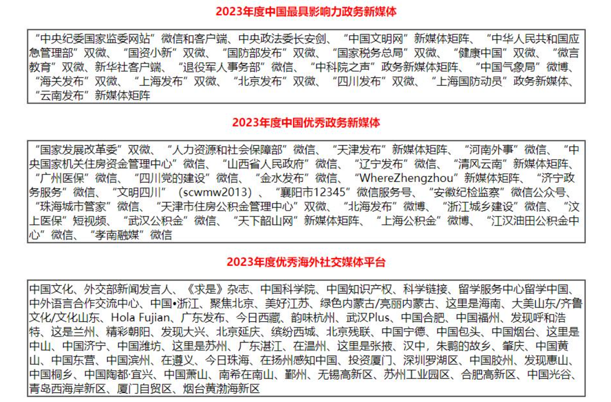 2023年是全面落实党的二十大会议部署的开局之年,也是全面建设社会主义现代化国家新征程的起步之年。上述各级党务政务平台全面落实二十大会议精神,坚持以人民为中心,以党中央要求为根本,以推动国家治理体系和治理能力现代化为目标,扎实推进数字中国和数字政府建设,不断强化党的组织建设和工作要求,不断探索创新网站运营管理模式,融合网站和新媒体矩阵平台,多渠道多形式多维立体积极发声,引导正面舆论、凝聚网民人气、方便群众办事,在网络上弘扬主旋律、传递正能量,为我国数字经济、数字政府、数字社会、数字中国建设保驾护航。上述党务政务平台在2023年综合影响力、网民关注度持续增强,为数字中国和数字政府建设提供了重要支撑,是全国各级党务政务平台网站建设、管理和运营的典范,经评估专家组评议共同推荐为2023年度中国最具影响力党务政务平台(网站)!