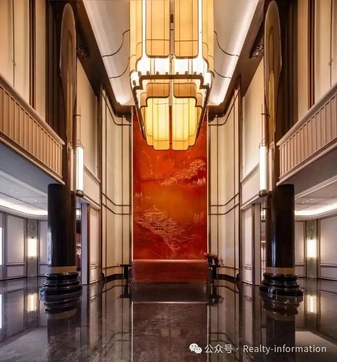 前厅高悬的蟠龙藻井,以紫禁城皇家规制为蓝本,鎏金蟠龙与星芒地面相映成辉,重现《营造法式》的严谨礼序;墙面《京华・锦绣》漆画以红金双色层层剔刻,亭台楼阁间流淌着《阿房宫赋》的磅礴气象,却以现代笔触消解厚重,恰如王府中式“中魂西技”精髓。